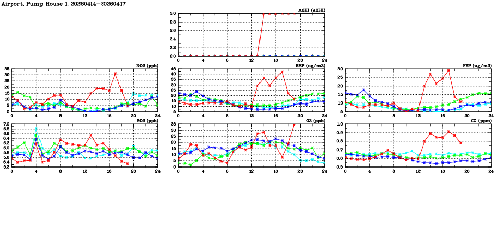 | Air Quality Data Time Series in Airport, Pump House 1 (2026/04/17) | ( Line colors: Day -3 Day -2 Day -1 Current day ) | 2D Map Current AQHI |