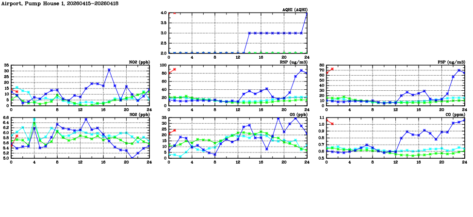 | Air Quality Data Time Series in Airport, Pump House 1 (2026/04/18) | ( Line colors: Day -3 Day -2 Day -1 Current day ) | 2D Map Current AQHI |