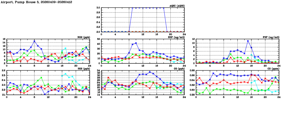 | Air Quality Data Time Series in Airport, Pump House 5 (2026/04/12) | ( Line colors: Day -3 Day -2 Day -1 Current day ) | 2D Map Current AQHI |