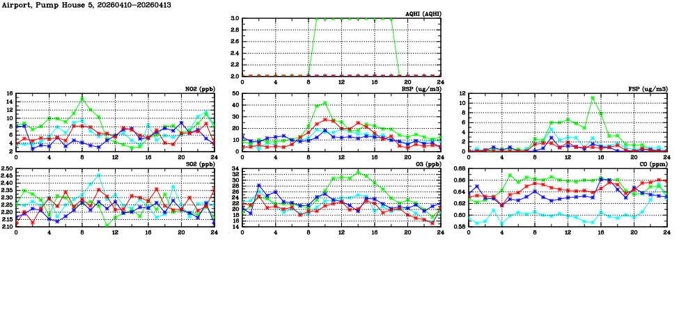 | Air Quality Data Time Series in Airport, Pump House 5 (2026/04/13) | ( Line colors: Day -3 Day -2 Day -1 Current day ) | 2D Map Current AQHI |