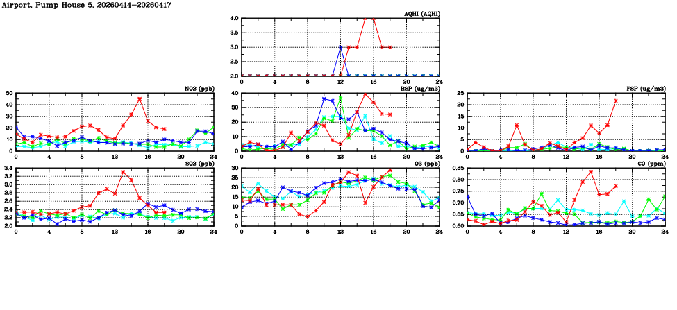 | Air Quality Data Time Series in Airport, Pump House 5 (2026/04/17) | ( Line colors: Day -3 Day -2 Day -1 Current day ) | 2D Map Current AQHI |