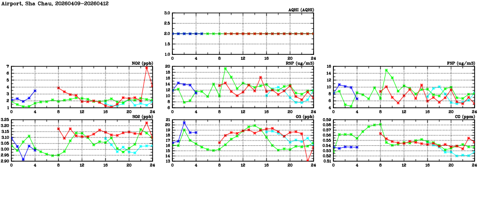 | Air Quality Data Time Series in Airport, Sha Chau (2026/04/12) | ( Line colors: Day -3 Day -2 Day -1 Current day ) | 2D Map Current AQHI |
