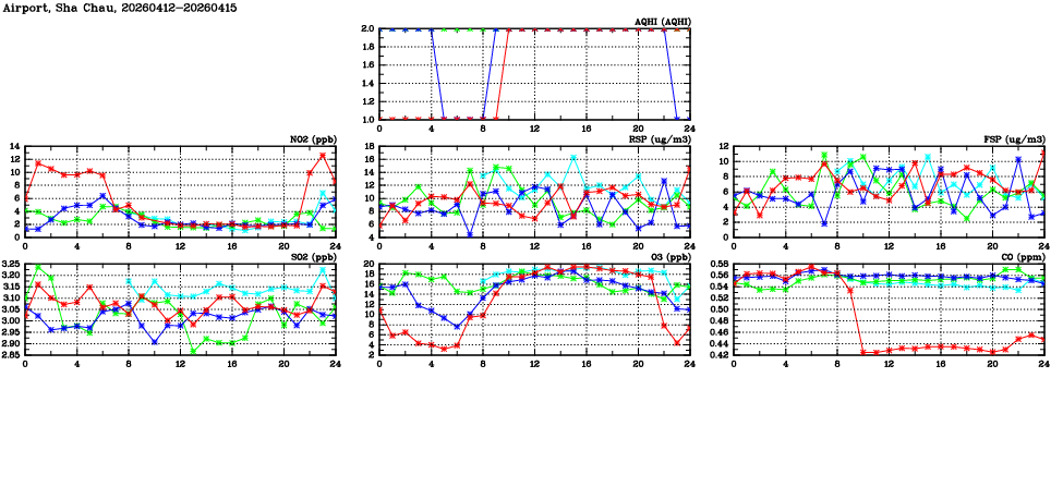 | Air Quality Data Time Series in Airport, Sha Chau (2026/04/15) | ( Line colors: Day -3 Day -2 Day -1 Current day ) | 2D Map Current AQHI |