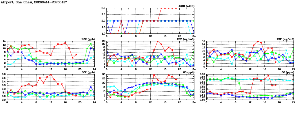 | Air Quality Data Time Series in Airport, Sha Chau (2026/04/17) | ( Line colors: Day -3 Day -2 Day -1 Current day ) | 2D Map Current AQHI |