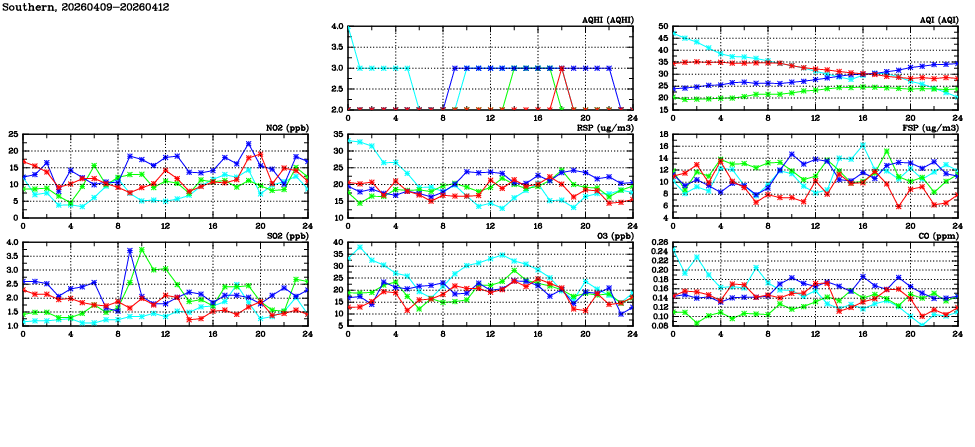 | Air Quality Data Time Series in Southern (2026/04/12) | ( Line colors: Day -3 Day -2 Day -1 Current day ) | 2D Map Current AQHI |