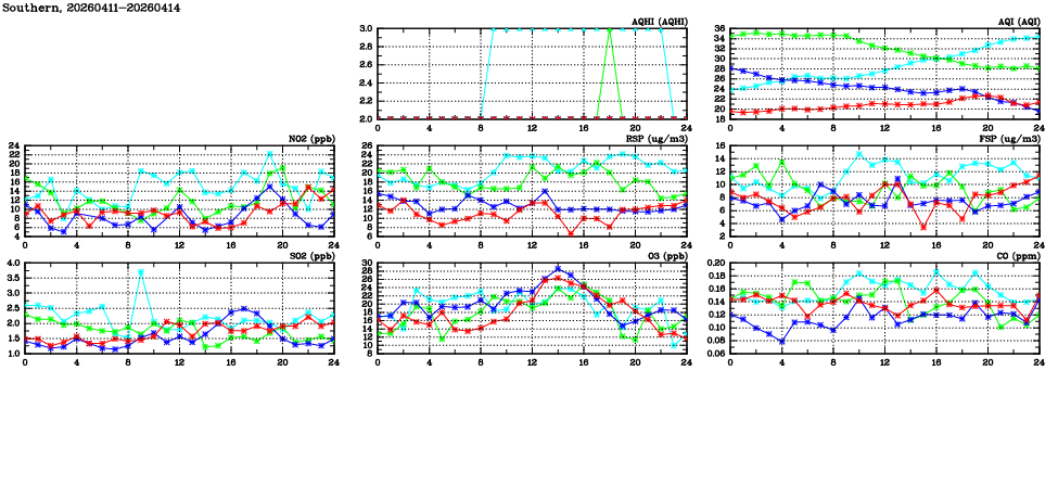 | Air Quality Data Time Series in Southern (2026/04/14) | ( Line colors: Day -3 Day -2 Day -1 Current day ) | 2D Map Current AQHI |