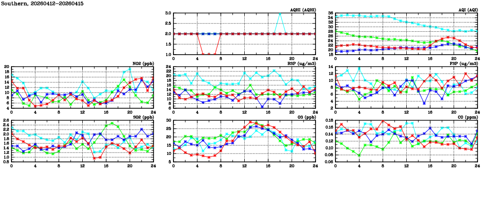 | Air Quality Data Time Series in Southern (2026/04/15) | ( Line colors: Day -3 Day -2 Day -1 Current day ) | 2D Map Current AQHI |