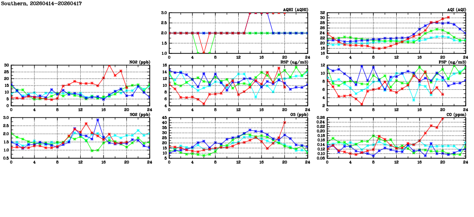 | Air Quality Data Time Series in Southern (2026/04/17) | ( Line colors: Day -3 Day -2 Day -1 Current day ) | 2D Map Current AQHI |