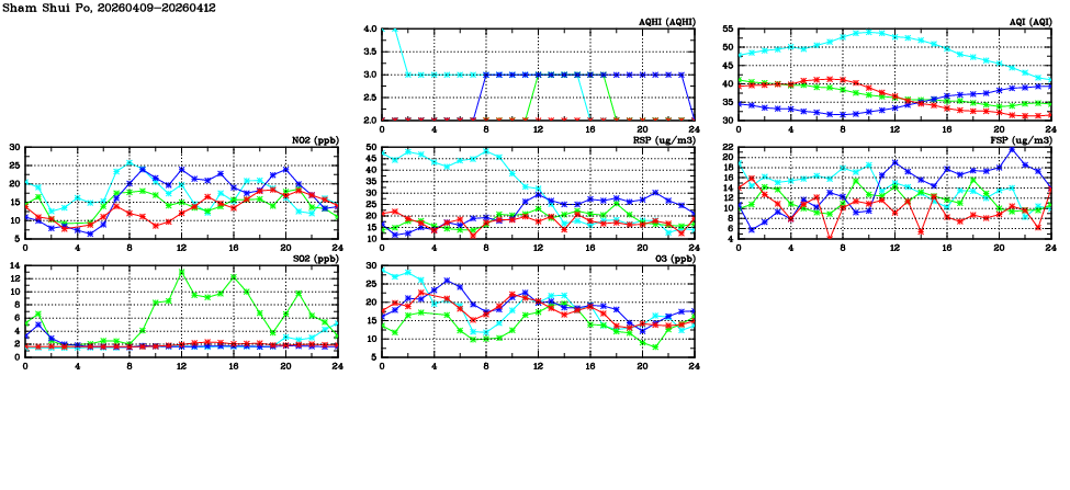 | Air Quality Data Time Series in Sham Shui Po (2026/04/12) | ( Line colors: Day -3 Day -2 Day -1 Current day ) | 2D Map Current AQHI |
