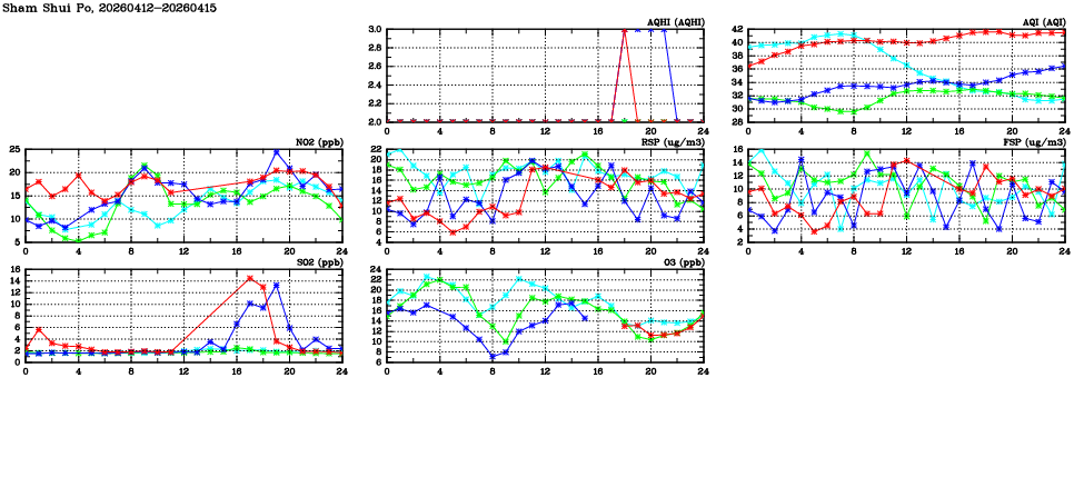 | Air Quality Data Time Series in Sham Shui Po (2026/04/15) | ( Line colors: Day -3 Day -2 Day -1 Current day ) | 2D Map Current AQHI |
