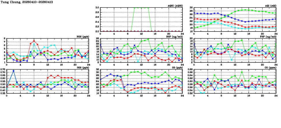 | Air Quality Data Time Series in Tung Chung (2026/04/13) | ( Line colors: Day -3 Day -2 Day -1 Current day ) | 2D Map Current AQHI |