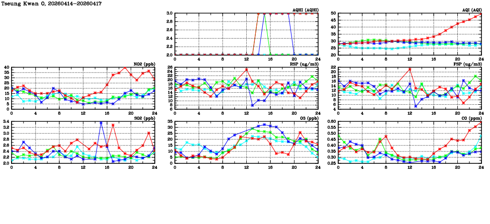 | Air Quality Data Time Series in Tseung Kwan O (2026/04/17) | ( Line colors: Day -3 Day -2 Day -1 Current day ) | 2D Map Current AQHI |