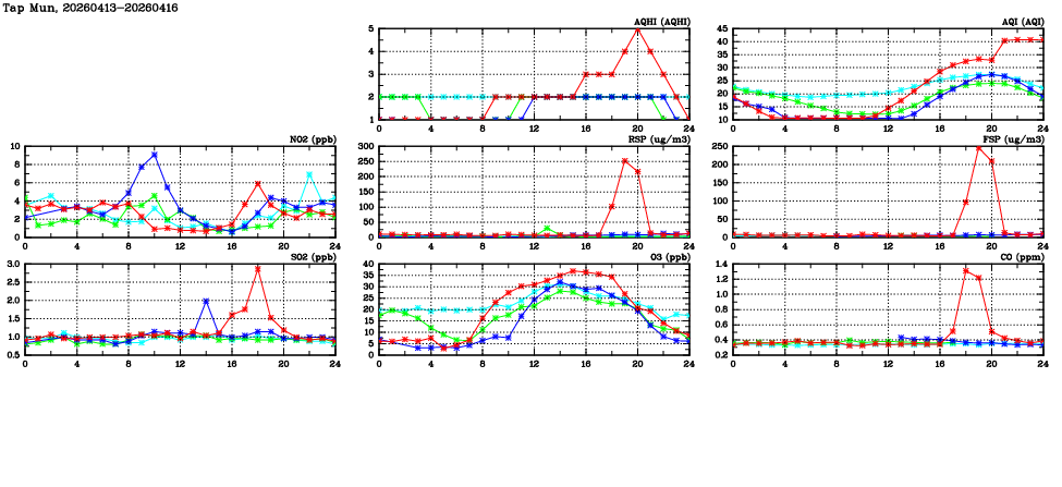 | Air Quality Data Time Series in Tap Mun (2026/04/16) | ( Line colors: Day -3 Day -2 Day -1 Current day ) | 2D Map Current AQHI |