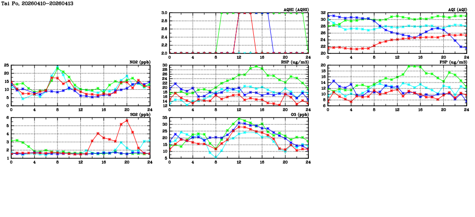 | Air Quality Data Time Series in Tai Po (2026/04/13) | ( Line colors: Day -3 Day -2 Day -1 Current day ) | 2D Map Current AQHI |