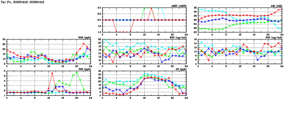 | Air Quality Data Time Series in Tai Po (2026/04/15) | ( Line colors: Day -3 Day -2 Day -1 Current day ) | 2D Map Current AQHI |
