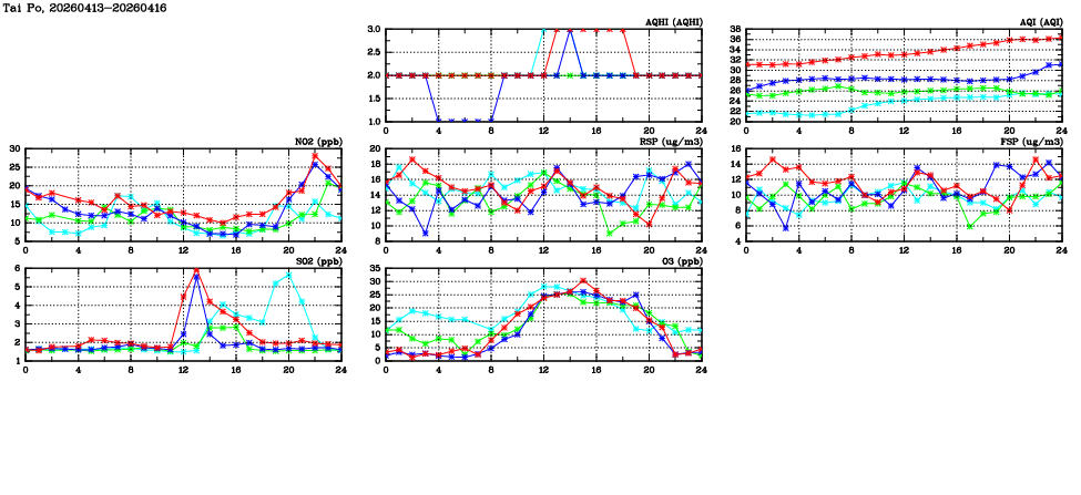 | Air Quality Data Time Series in Tai Po (2026/04/16) | ( Line colors: Day -3 Day -2 Day -1 Current day ) | 2D Map Current AQHI |