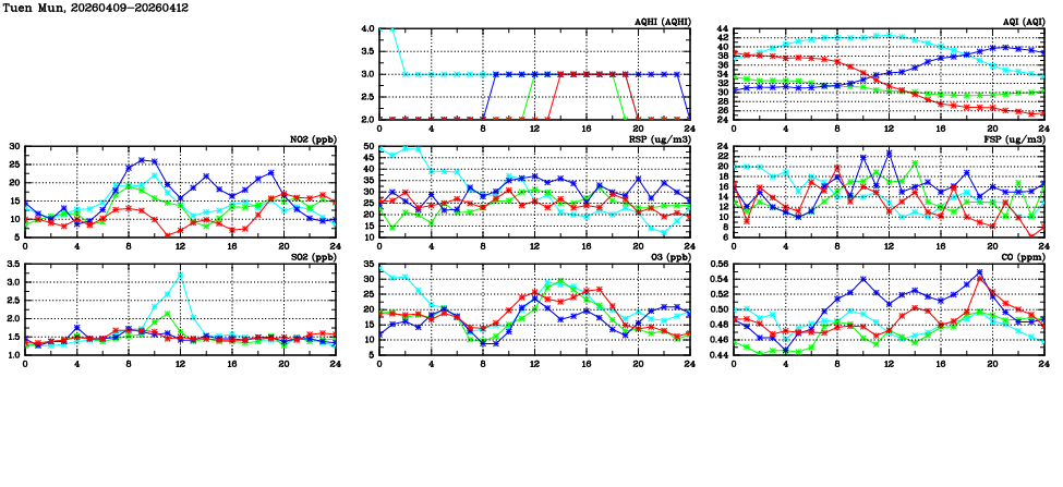 | Air Quality Data Time Series in Tuen Mun (2026/04/12) | ( Line colors: Day -3 Day -2 Day -1 Current day ) | 2D Map Current AQHI |
