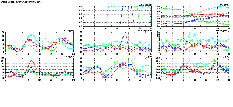 | Air Quality Data Time Series in Tuen Mun (2026/04/14) | ( Line colors: Day -3 Day -2 Day -1 Current day ) | 2D Map Current AQHI |