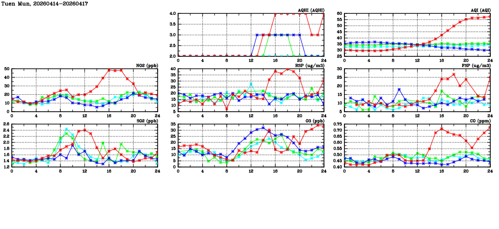 | Air Quality Data Time Series in Tuen Mun (2026/04/17) | ( Line colors: Day -3 Day -2 Day -1 Current day ) | 2D Map Current AQHI |