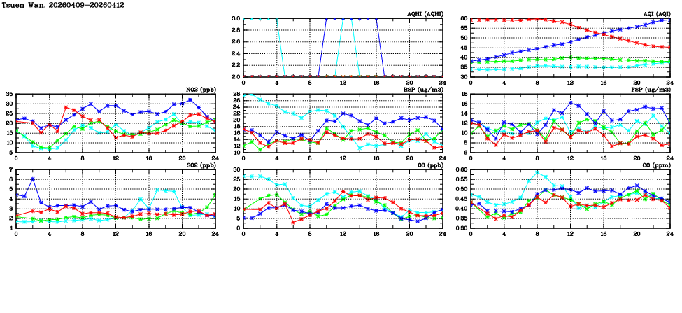 | Air Quality Data Time Series in Tsuen Wan (2026/04/12) | ( Line colors: Day -3 Day -2 Day -1 Current day ) | 2D Map Current AQHI |
