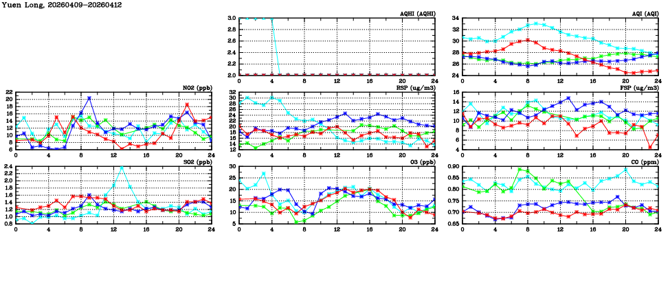 | Air Quality Data Time Series in Yuen Long (2026/04/12) | ( Line colors: Day -3 Day -2 Day -1 Current day ) | 2D Map Current AQHI |