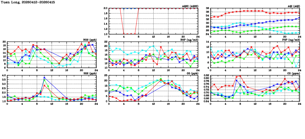 | Air Quality Data Time Series in Yuen Long (2026/04/15) | ( Line colors: Day -3 Day -2 Day -1 Current day ) | 2D Map Current AQHI |