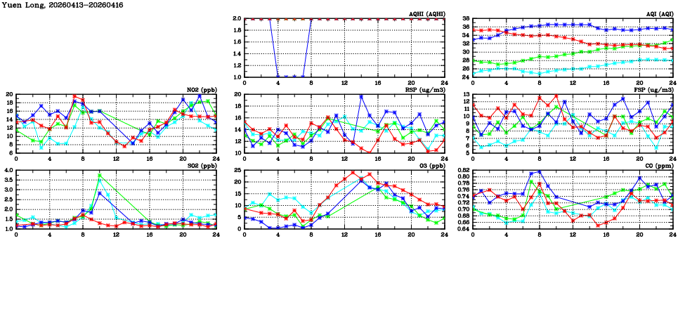 | Air Quality Data Time Series in Yuen Long (2026/04/16) | ( Line colors: Day -3 Day -2 Day -1 Current day ) | 2D Map Current AQHI |