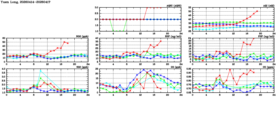 | Air Quality Data Time Series in Yuen Long (2026/04/17) | ( Line colors: Day -3 Day -2 Day -1 Current day ) | 2D Map Current AQHI |